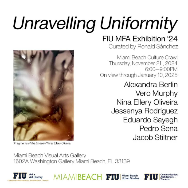 "Unravelling Uniformity" is an exhibition featuring the diverse range of works by seven students from Florida International University's MFA program. Each artist employs a unique medium to delve into the complex themes of memory, place, and identity. Through their varied artistic expressions, the exhibition challenges the notion of uniformity, inviting viewers to explore the intricate layers of personal and collective experiences. This showcase not only highlights the individual creativity of each student but also offers a rich tapestry of perspectives that provoke thought and inspire dialogue.